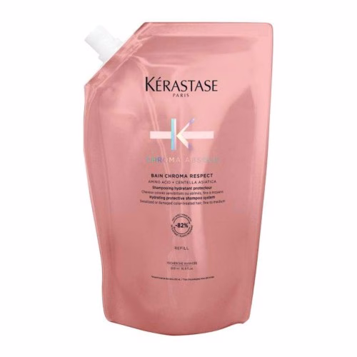 Modo de Uso: Verter o conteúdo da Kérastase Bain Chroma Respect Recarga no frasco de alumínio previamente limpo e seco. Aplicar uma pequena quantidade no cabelo húmido, massajar suavemente para criar espuma e distribuir pelos comprimentos. Por fim, enxaguar abundantemente com água e repetir se necessário para uma luminosidade máxima.